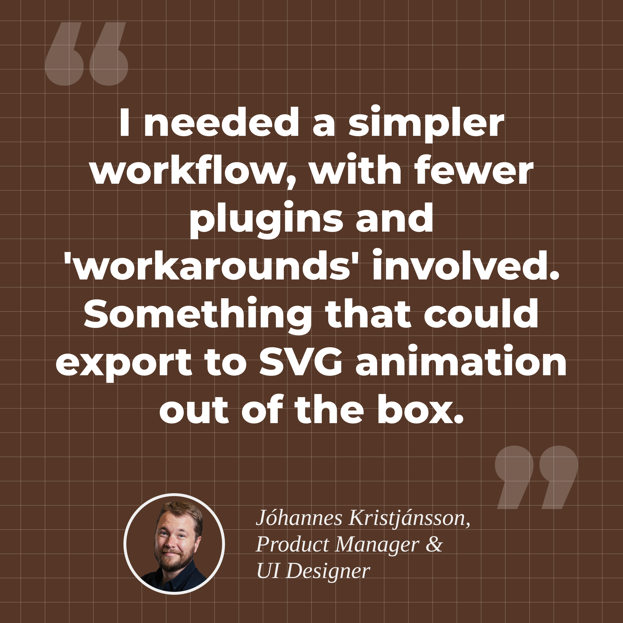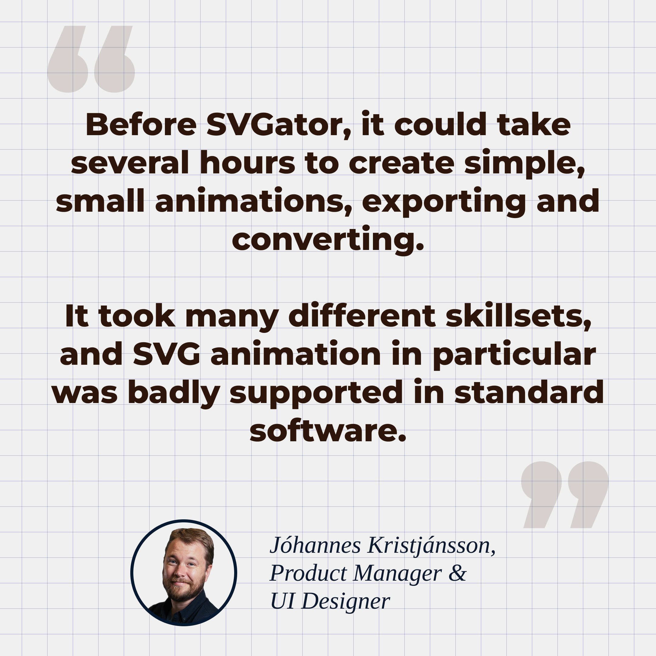 Jóhannes came to SVGator with a clear set of requirements. He needed a simpler workflow with fewer plugins and workarounds. He needed something he could get up and running with quickly, without a steep learning curve getting in the way. And he needed a tool that could export SVG animations out of the box, without additional steps or conversion processes on top.