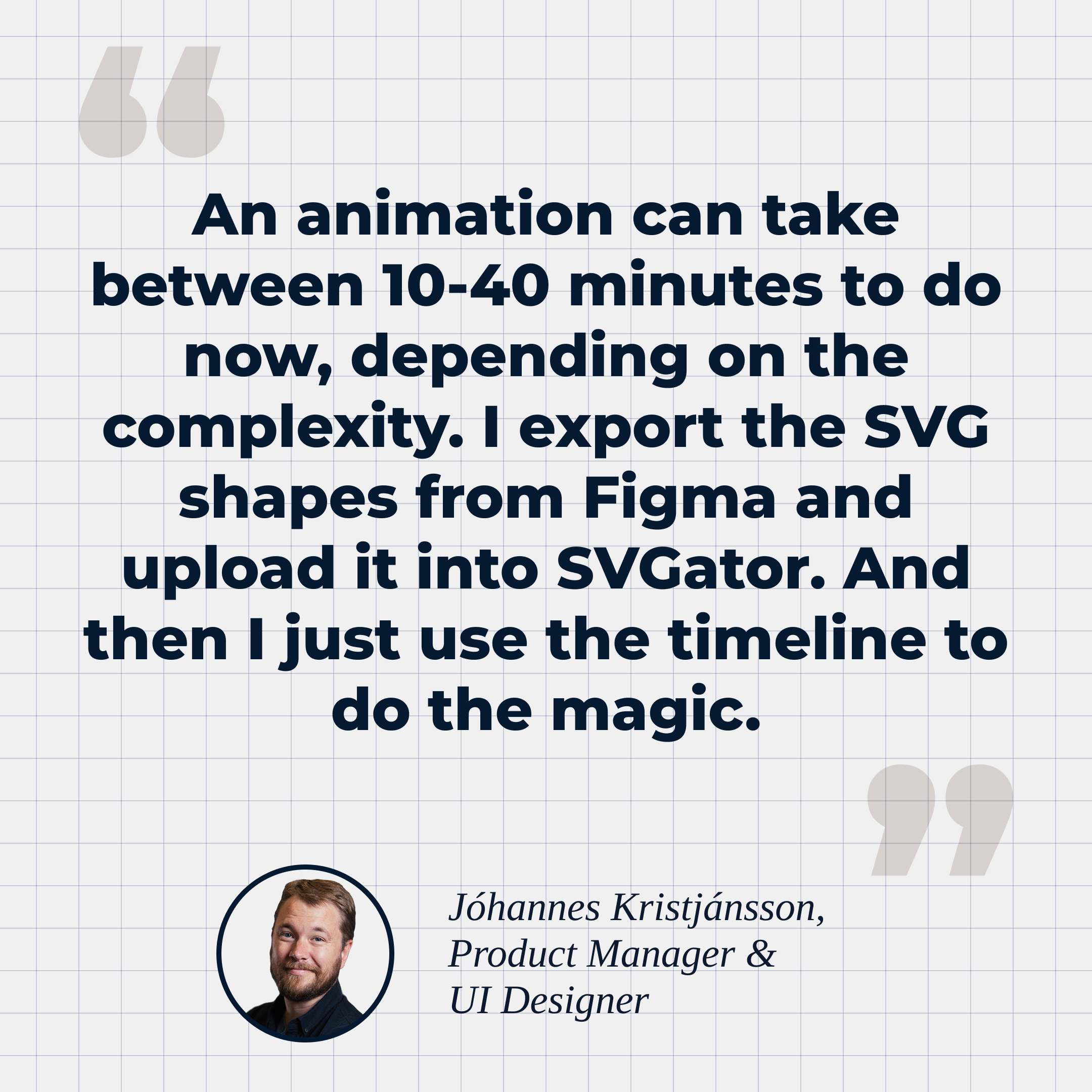 The workflow now is straightforward. Jóhannes exports SVG shapes from Figma, uploads them into SVGator, and works on the timeline from there. An animation that would have taken several hours before now takes between 10 and 40 minutes, depending on complexity. He uses SVGator for logo and icon animations.