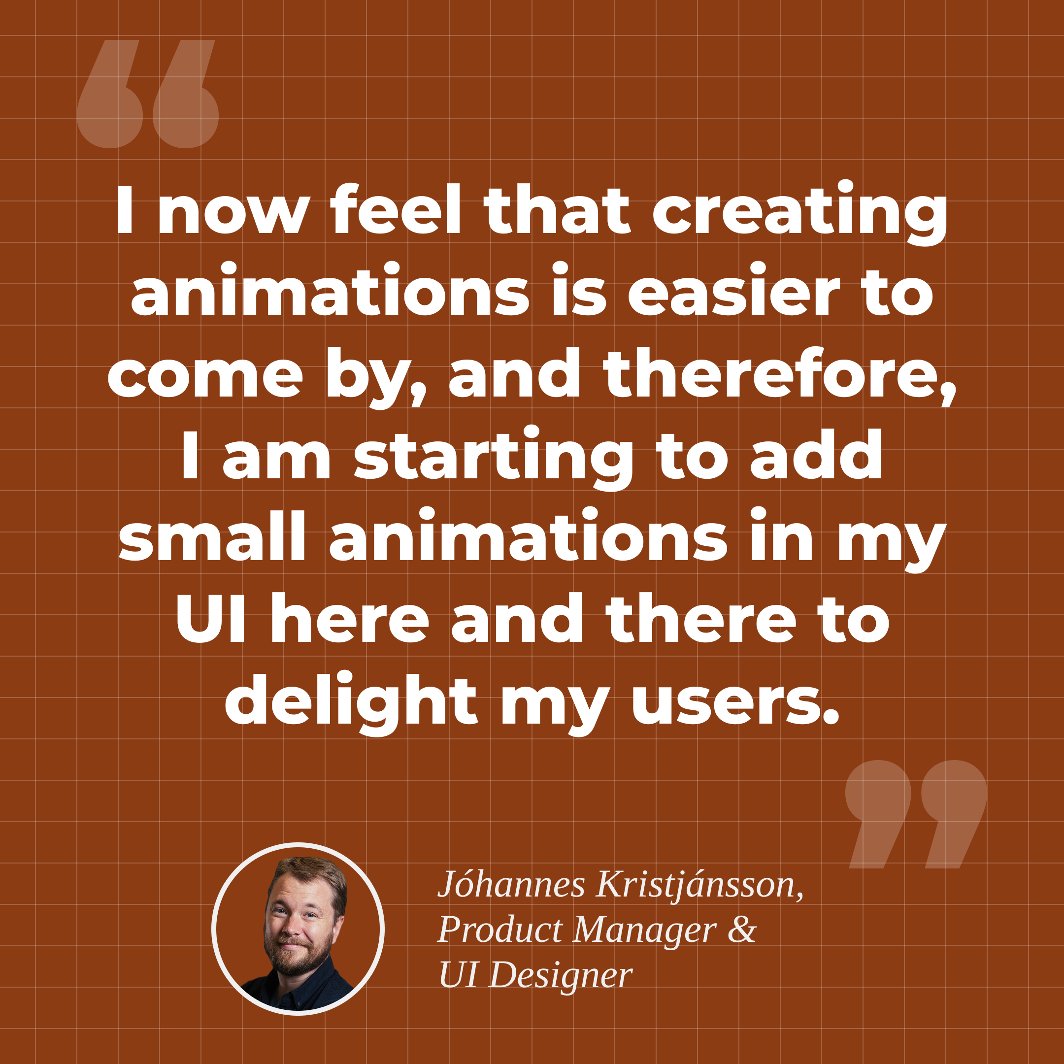 Jóhannes Kristjánsson is a Product Manager and UI Designer whose core work is building product interfaces, with animation sitting somewhere on the edges of his role: something he needs from time to time, but not a discipline he built his career around.