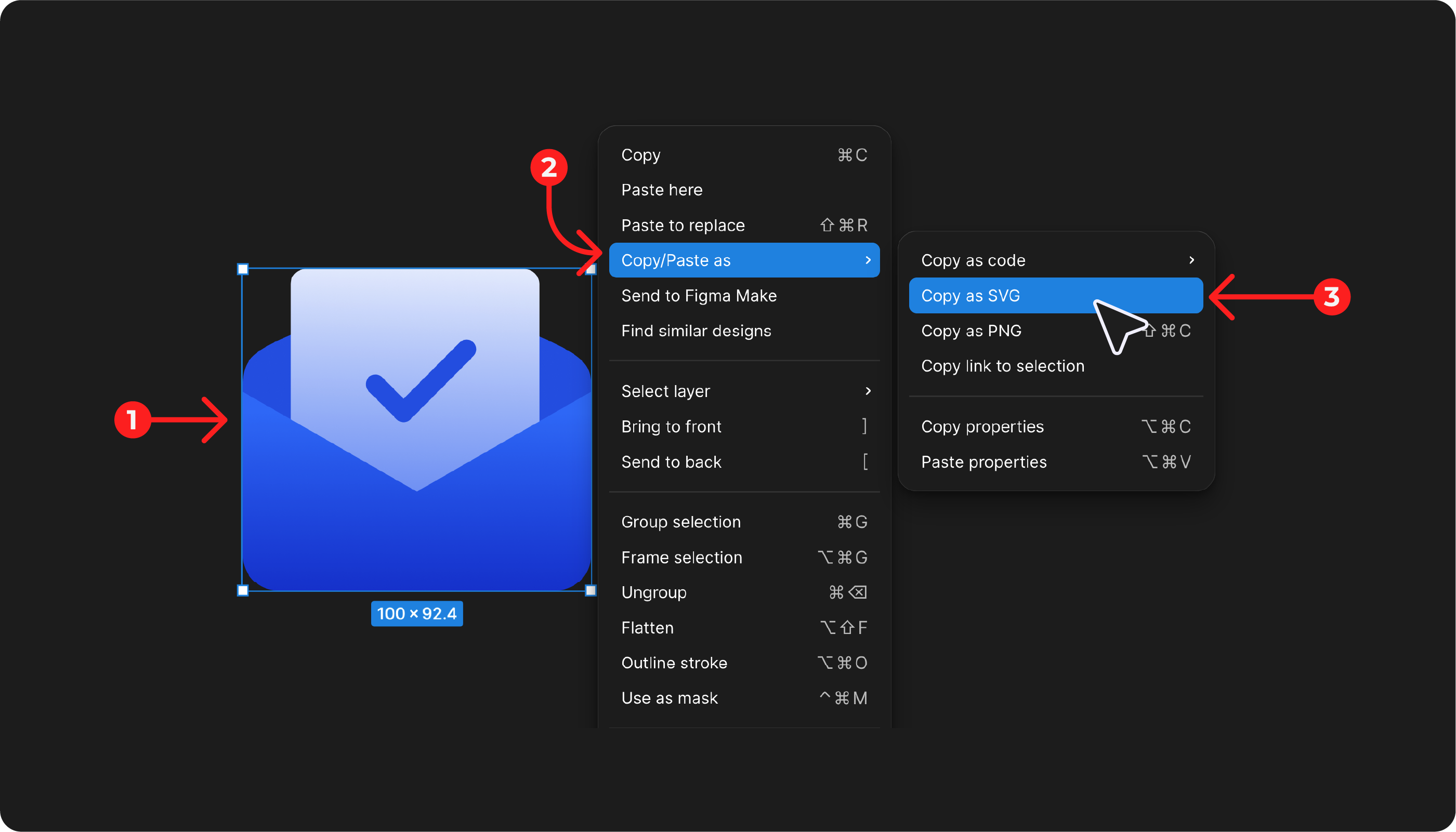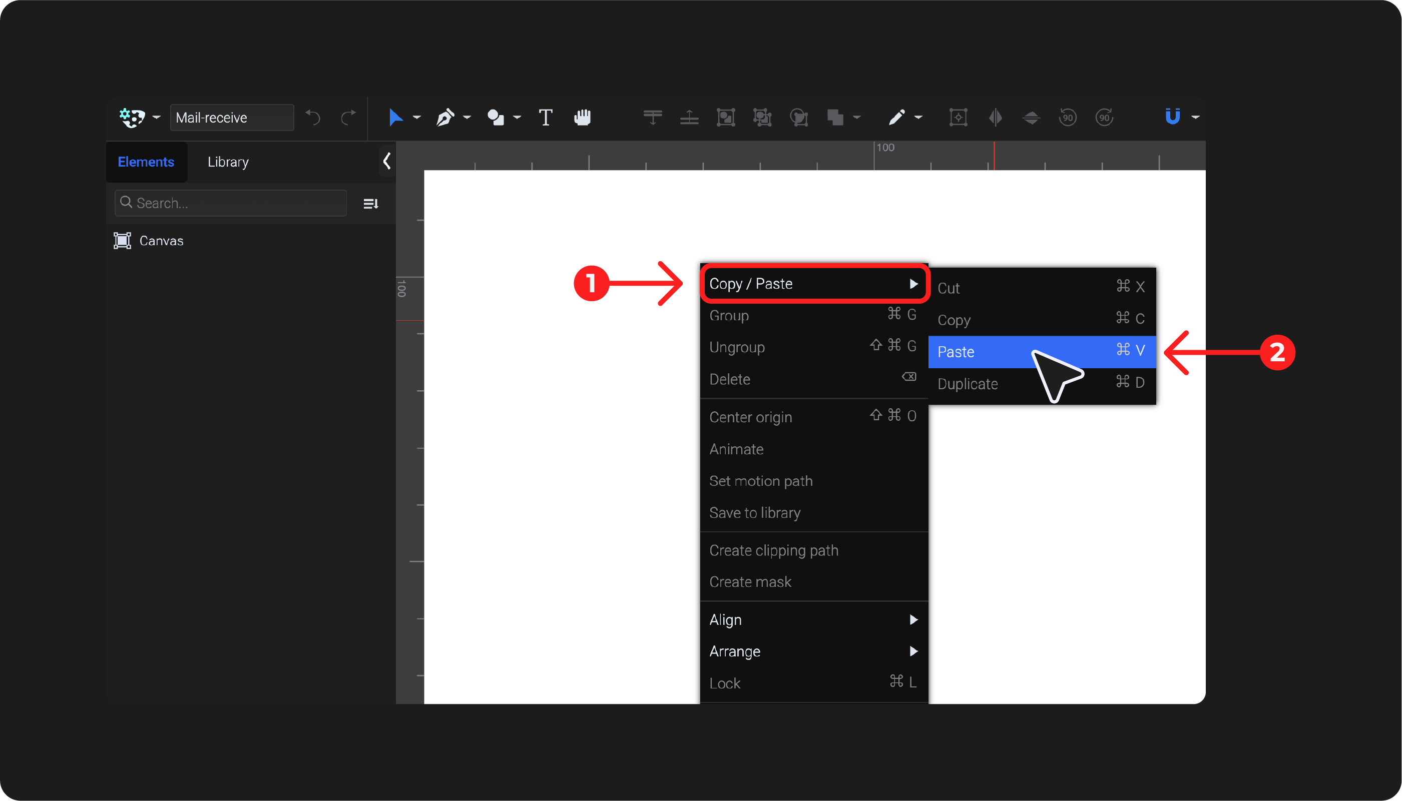 Select the SVG or PNG you want to copy from Figma, right-click the element, choose Copy → Copy as SVG or Copy as PNG, then go to your SVGator project and paste it by right-clicking and choosing Copy/Paste → Paste (or by pressing Command/Ctrl+V)