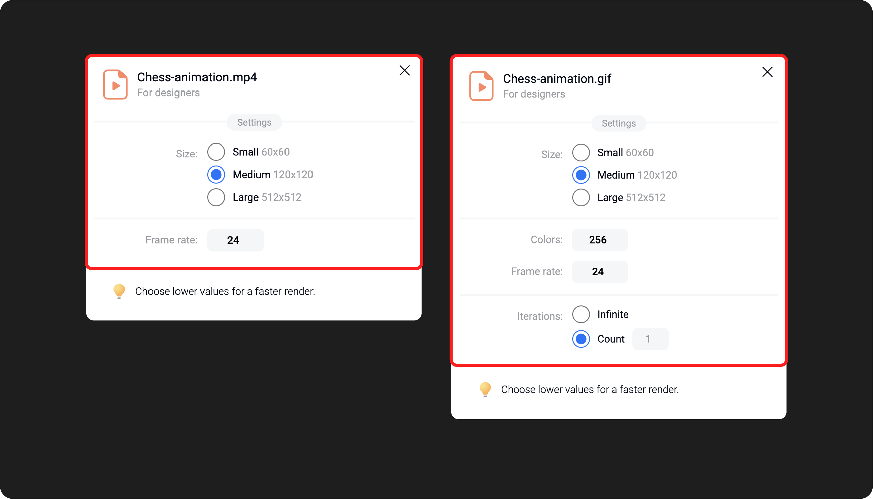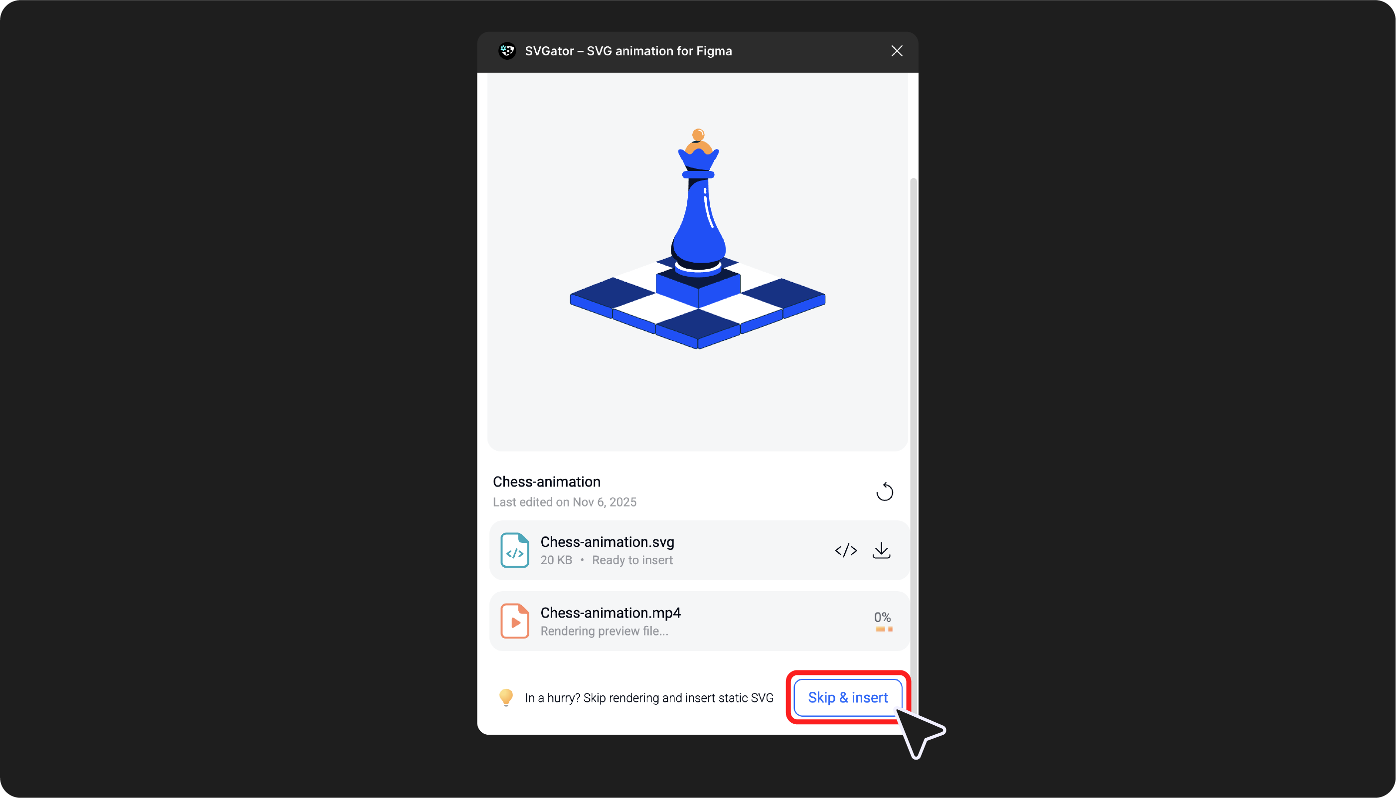 If you don't want to wait for the Preview file (GIF or MP4) to render, click Skip & insert to add a static SVG to your Figma project immediately. The static SVG will appear in the editor, and you can view it in Present or Preview mode.