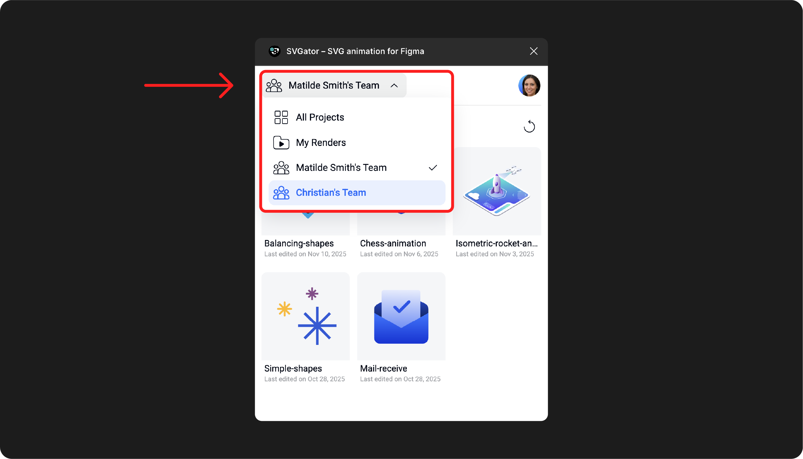 You can also add shared projects from your SVGator Team. Access the top bar of the plugin, select your team, and you'll see all shared projects available for use.