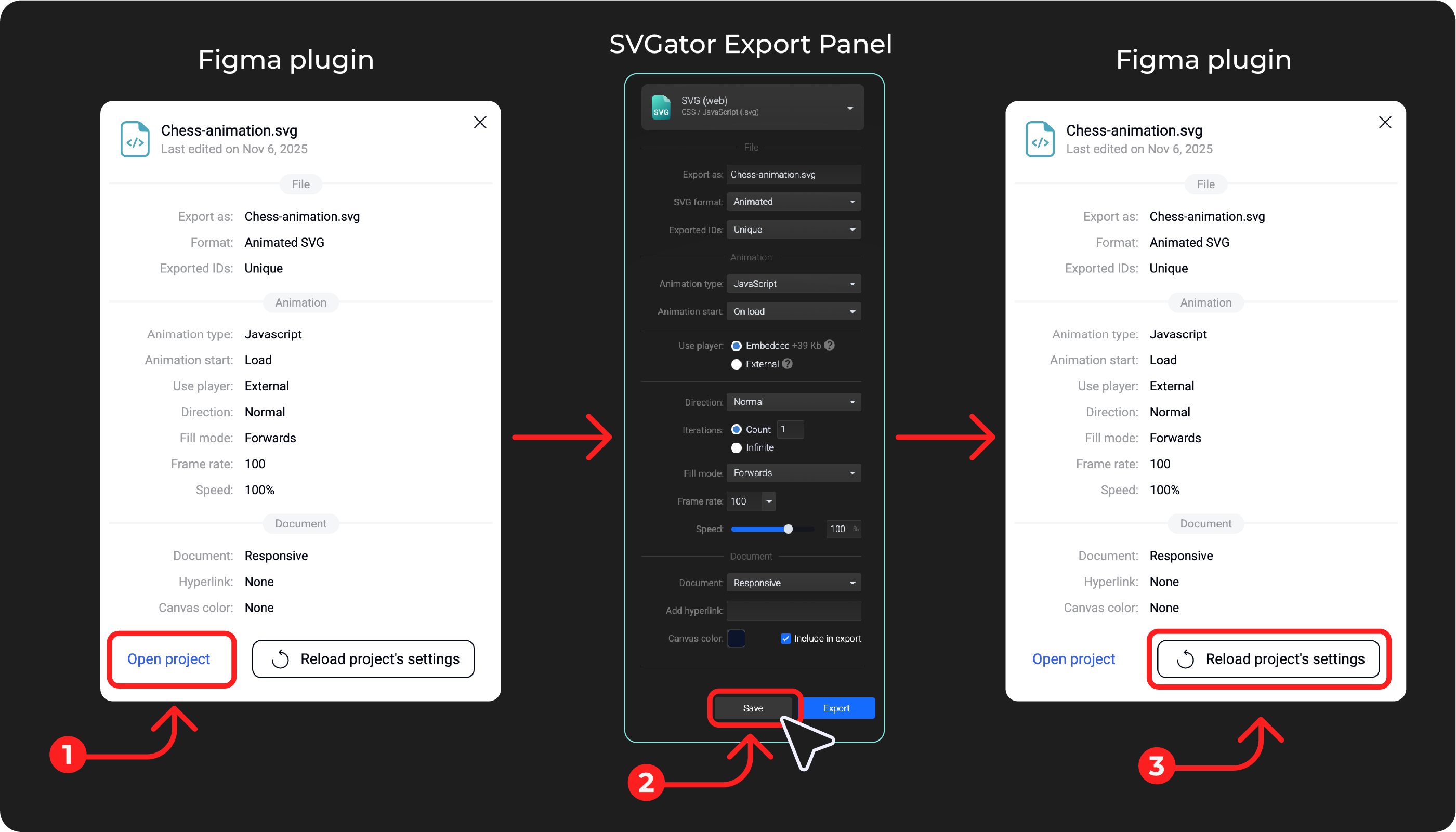 - Production-ready file settings – Must be edited in SVGator's editor. After making changes and clicking Save, use Reload project's settings in the plugin to sync.