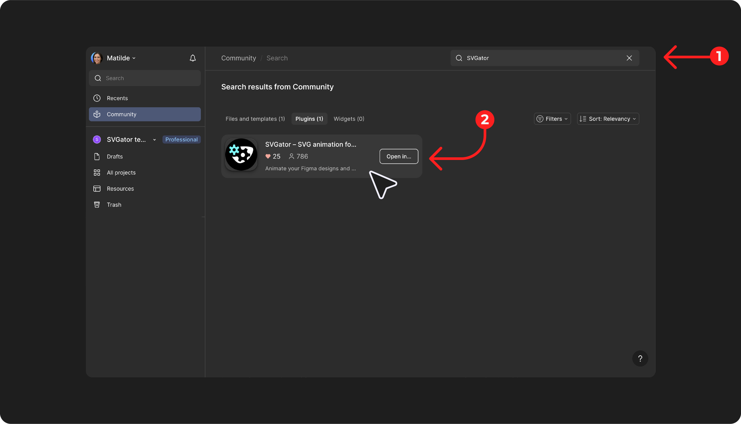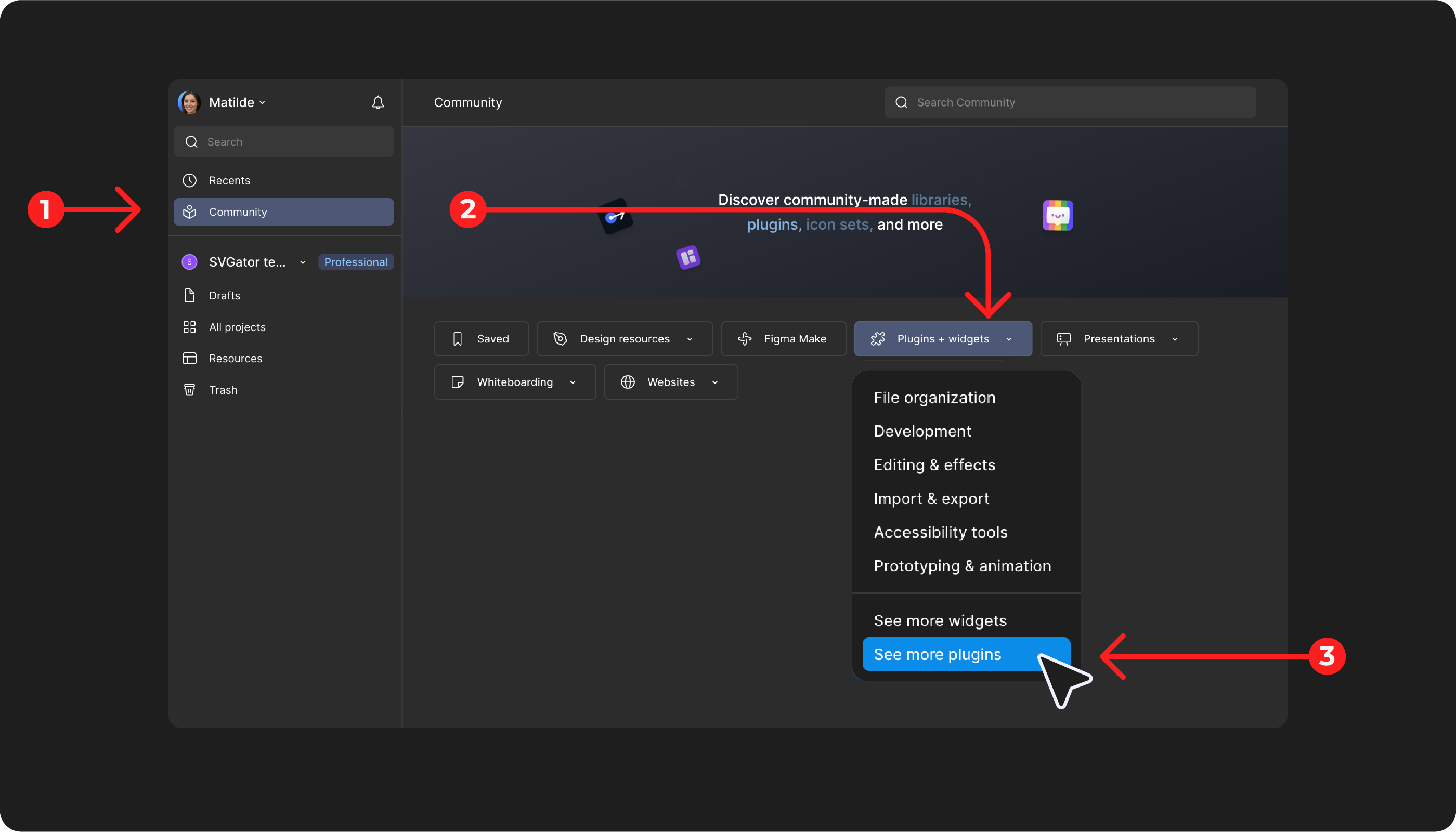 To install the SVGator plugin in your Figma account, navigate to Community → Plugins + Widgets → See more plugins, then enter “SVGator” in the search bar.