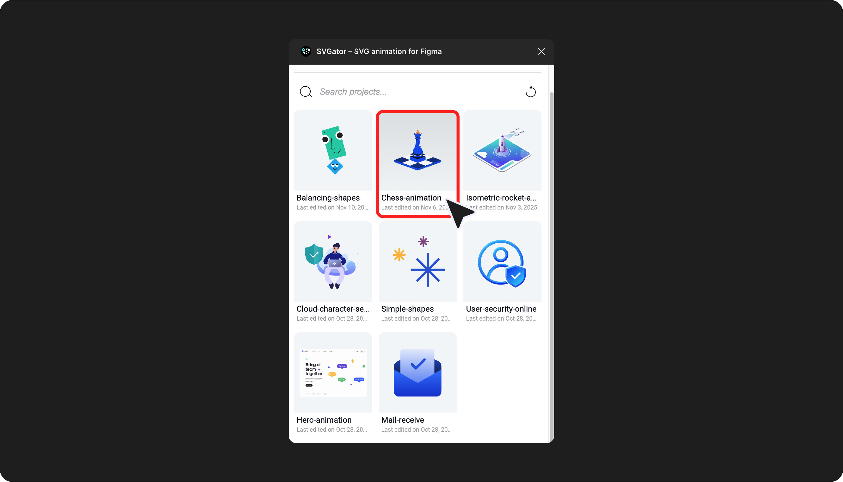 After authorizing the plugin, you will be able to access all your projects, your renders, and any projects shared within your SVGator Team (if you are part of one) directly through the plugin.