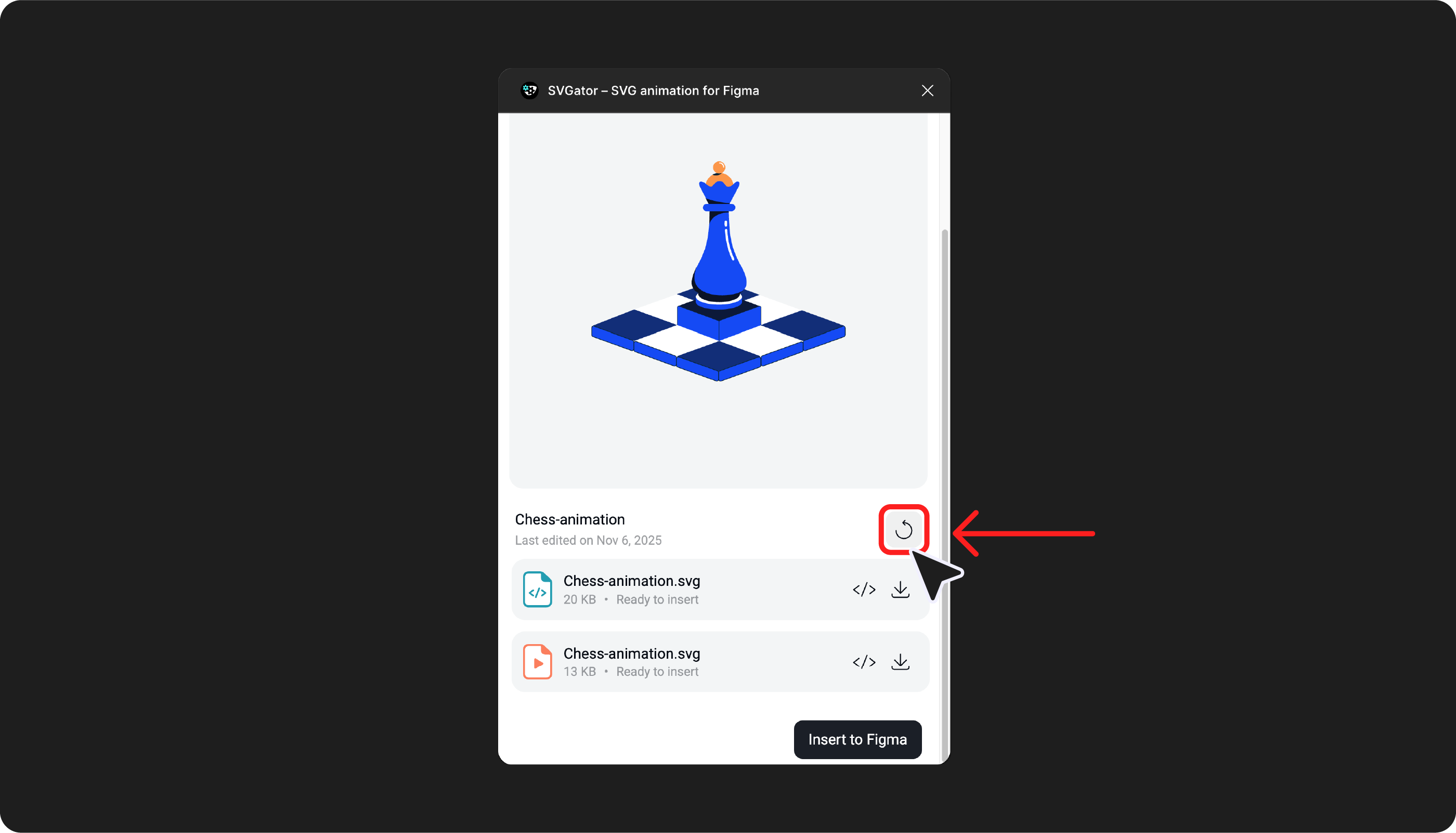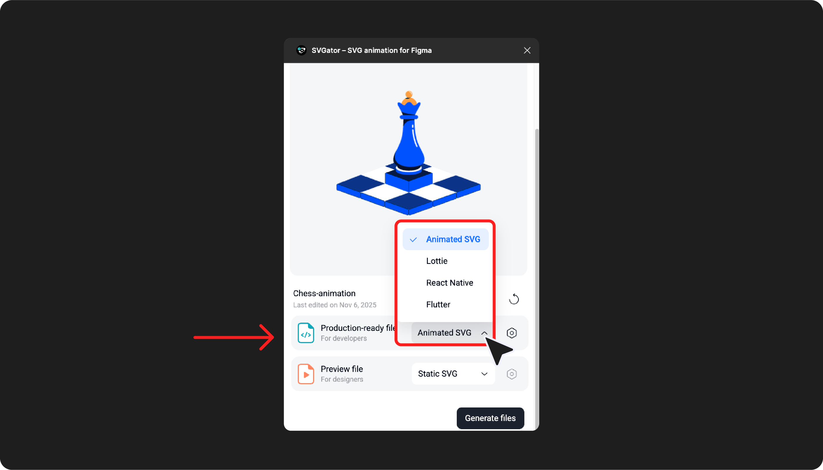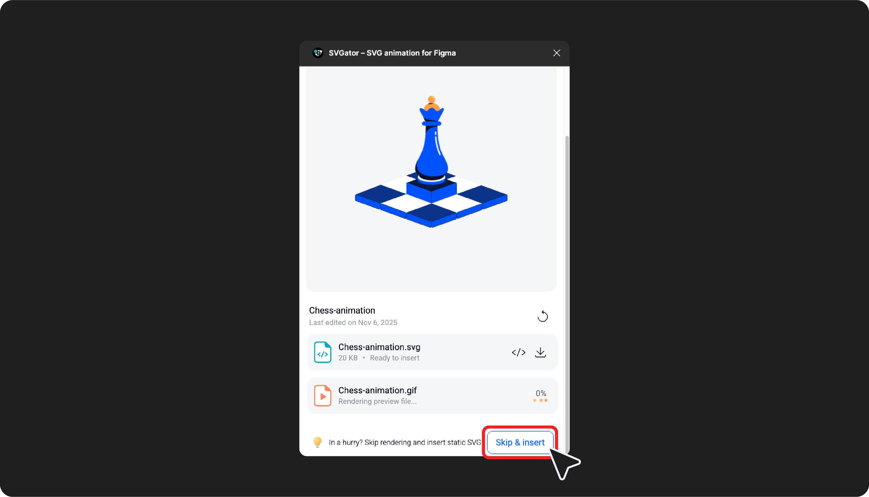 After selecting the export options you need, click Generate files. A static SVG preview file will be generated quickly. If you don’t want to wait for the GIF or MP4 files to render, you can click Skip & insert to instantly add the SVG to your Figma project instead.