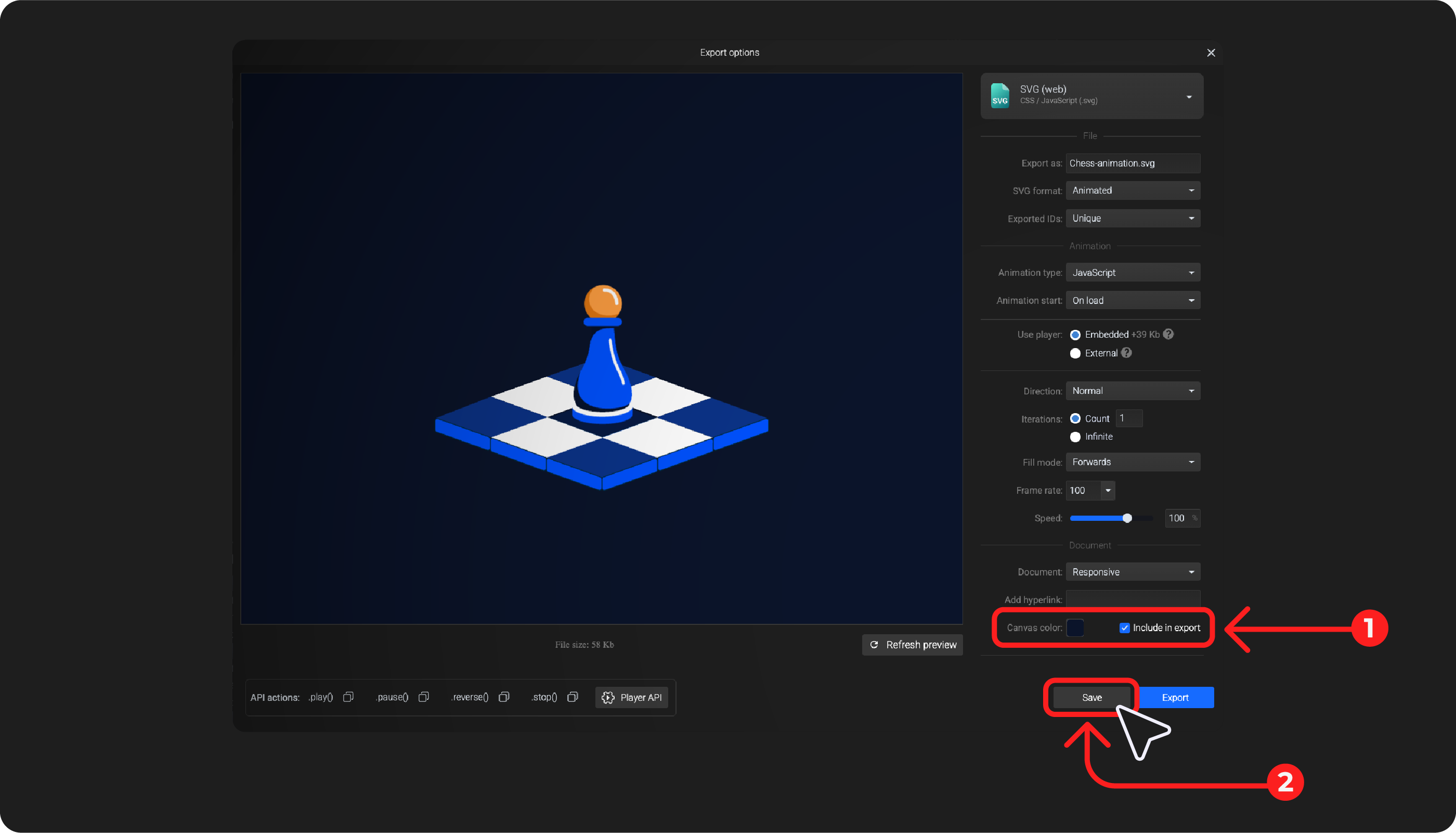 Note: Always make sure to click the Save button after editing the Export settings in SVGator so that the changes are detected by the plugin.