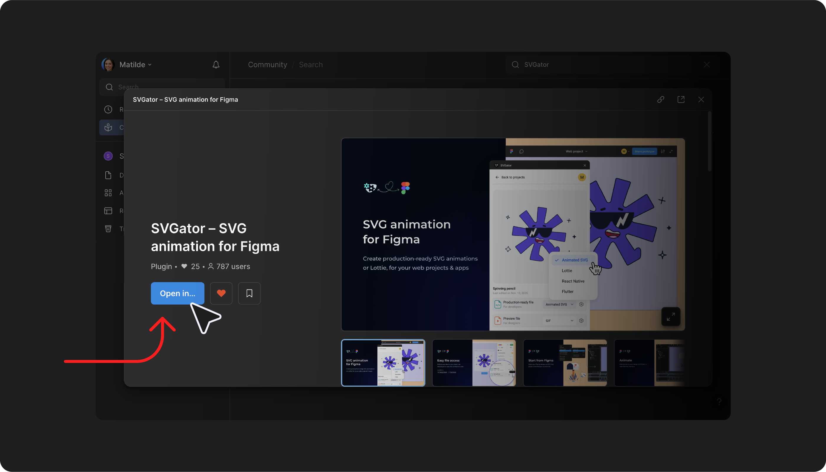 Under Plugins you’ll find “SVGator - SVG animation for Figma”. Select Open in… → Choose file → Run.