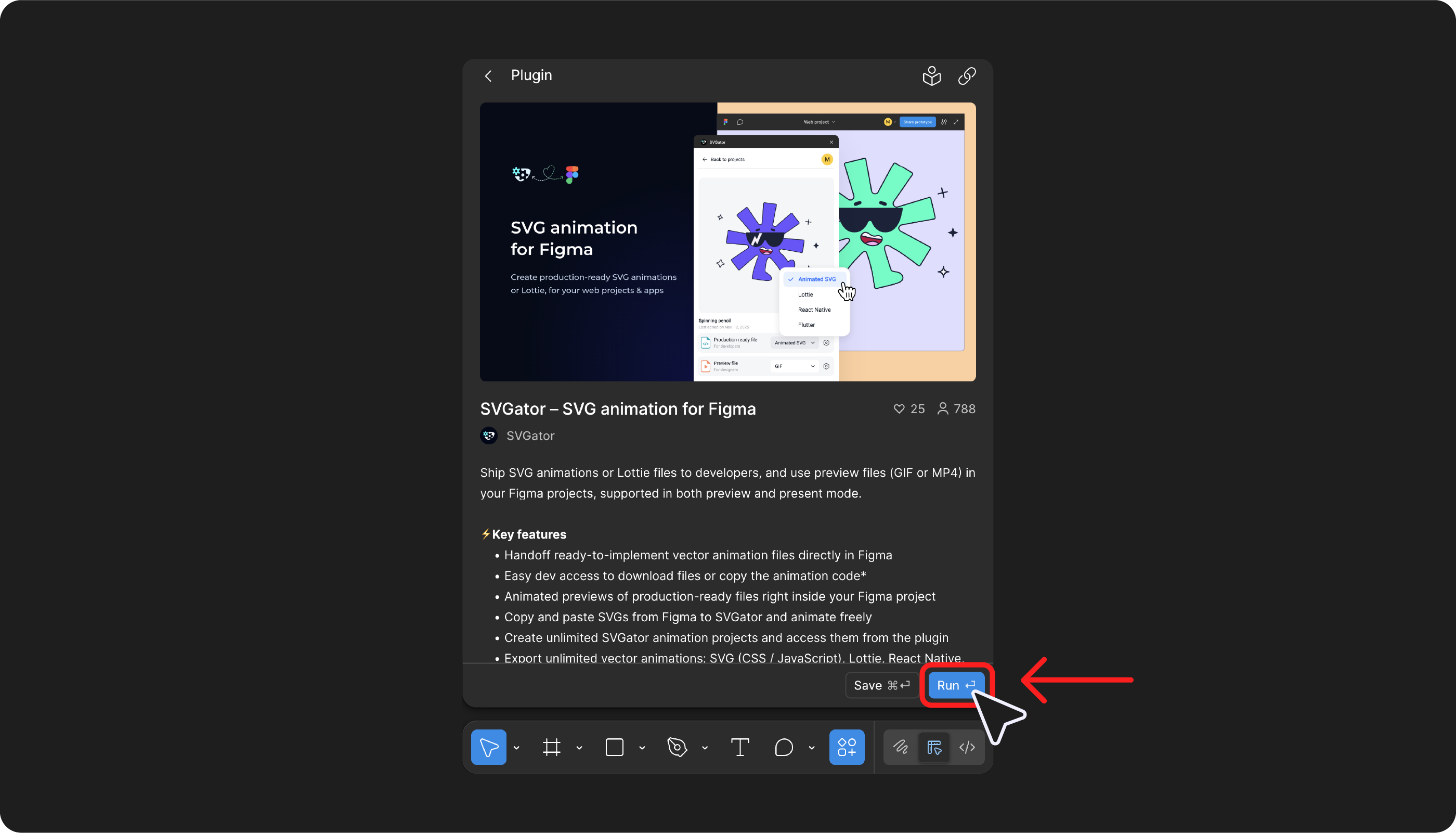 For developers: If you only need production-ready files, an SVGator account is not required. Install the plugin, open your Figma project, select the animation layer, click the Actions button, choose the SVGator plugin, and download the production-ready file.