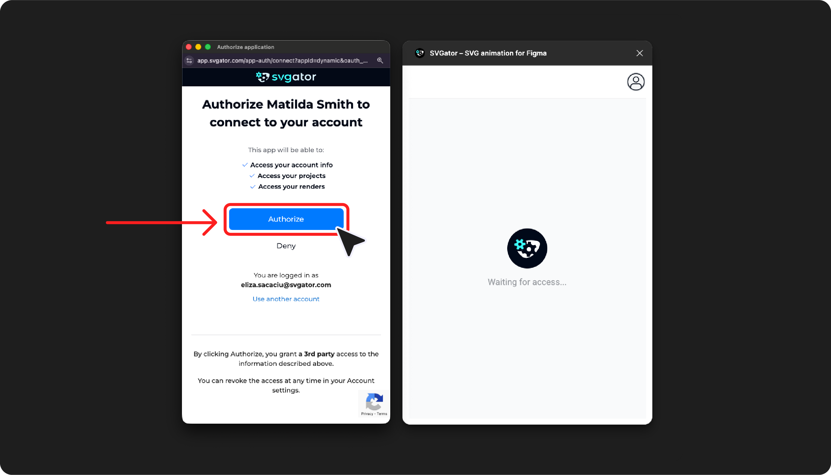 The next step is to click the Log in button, then, in the page that opens, click Authorize to allow the SVGator plugin to access your SVGator account and its content.