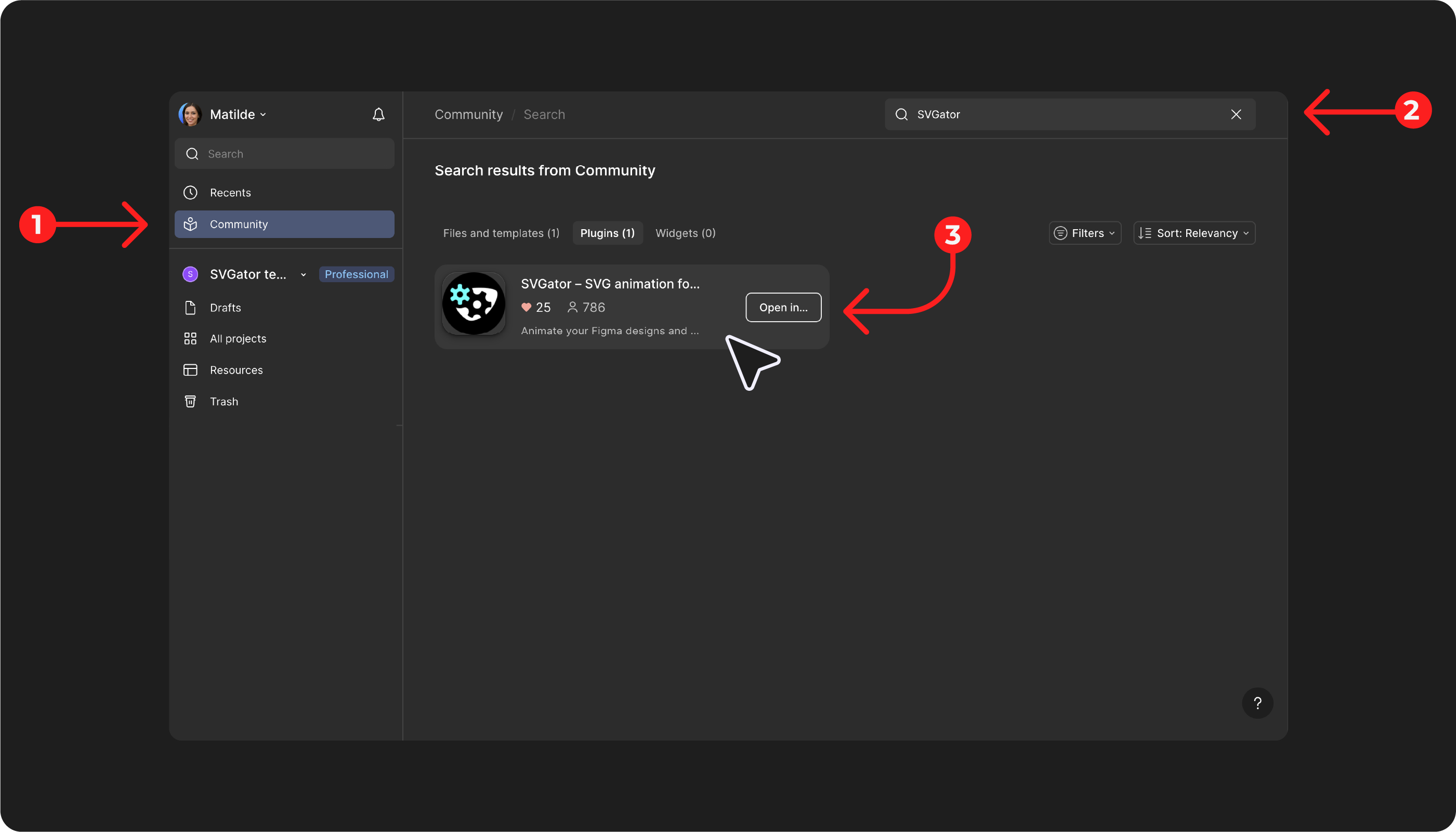To access your SVGator projects and insert them in Figma, first install and run the SVGator plugin. You can do this either by:
