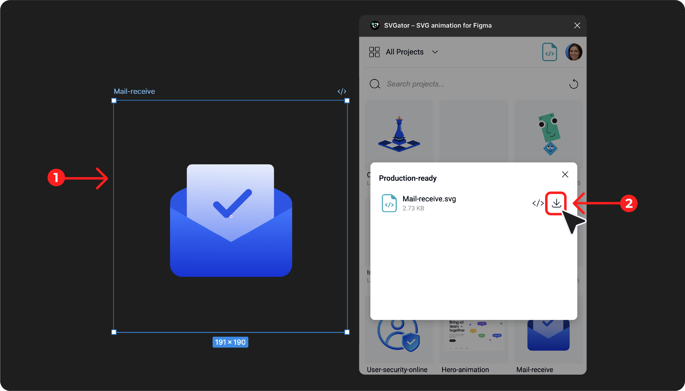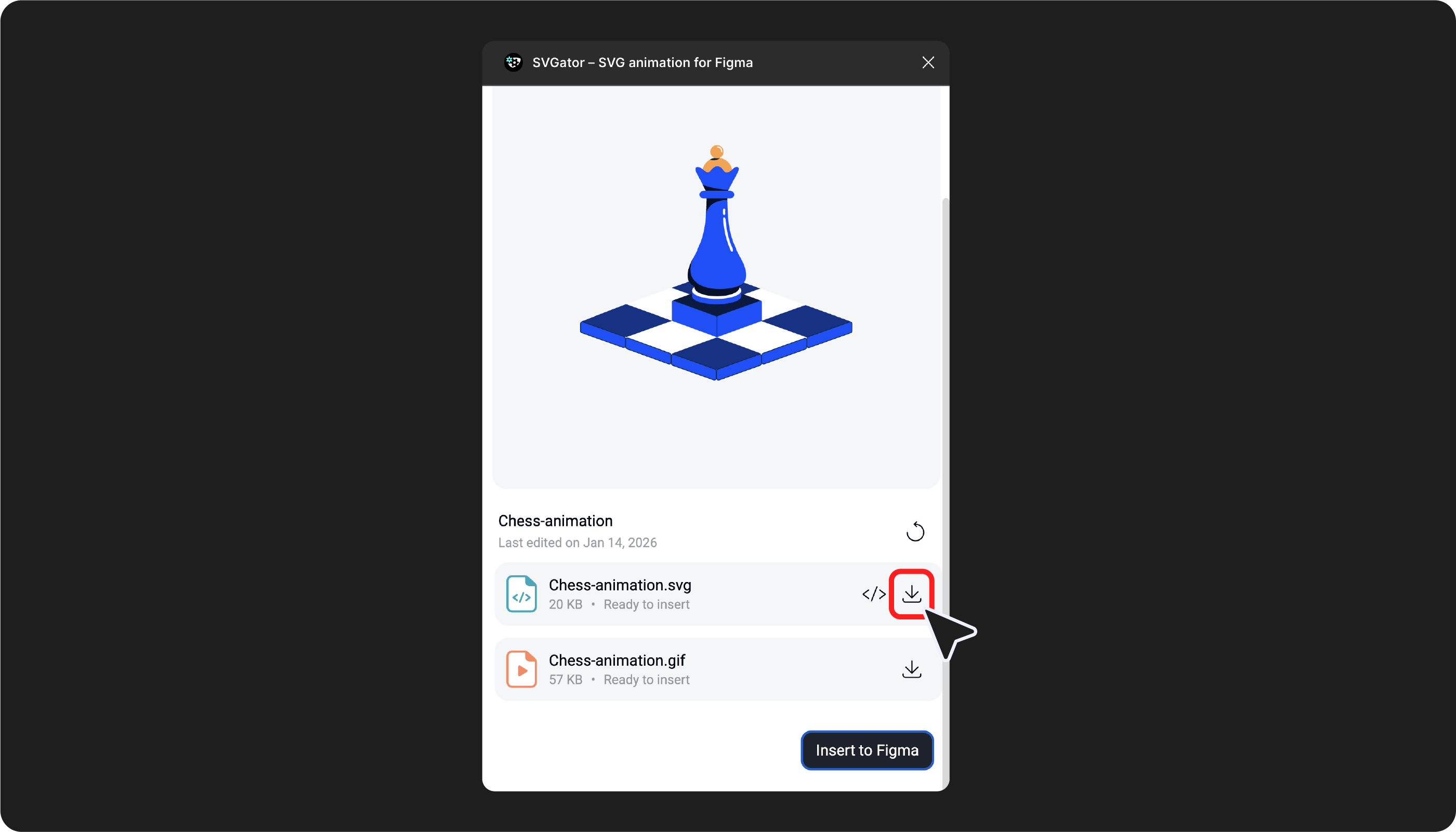 - Previous renders: select the Preview file inserted in the Figma project, while having the SVGator Figma Plugin open, and click on the Download button that will appear in the pop-up. This way, you can select any rendered Preview file and have immediate access to the Production-ready file.