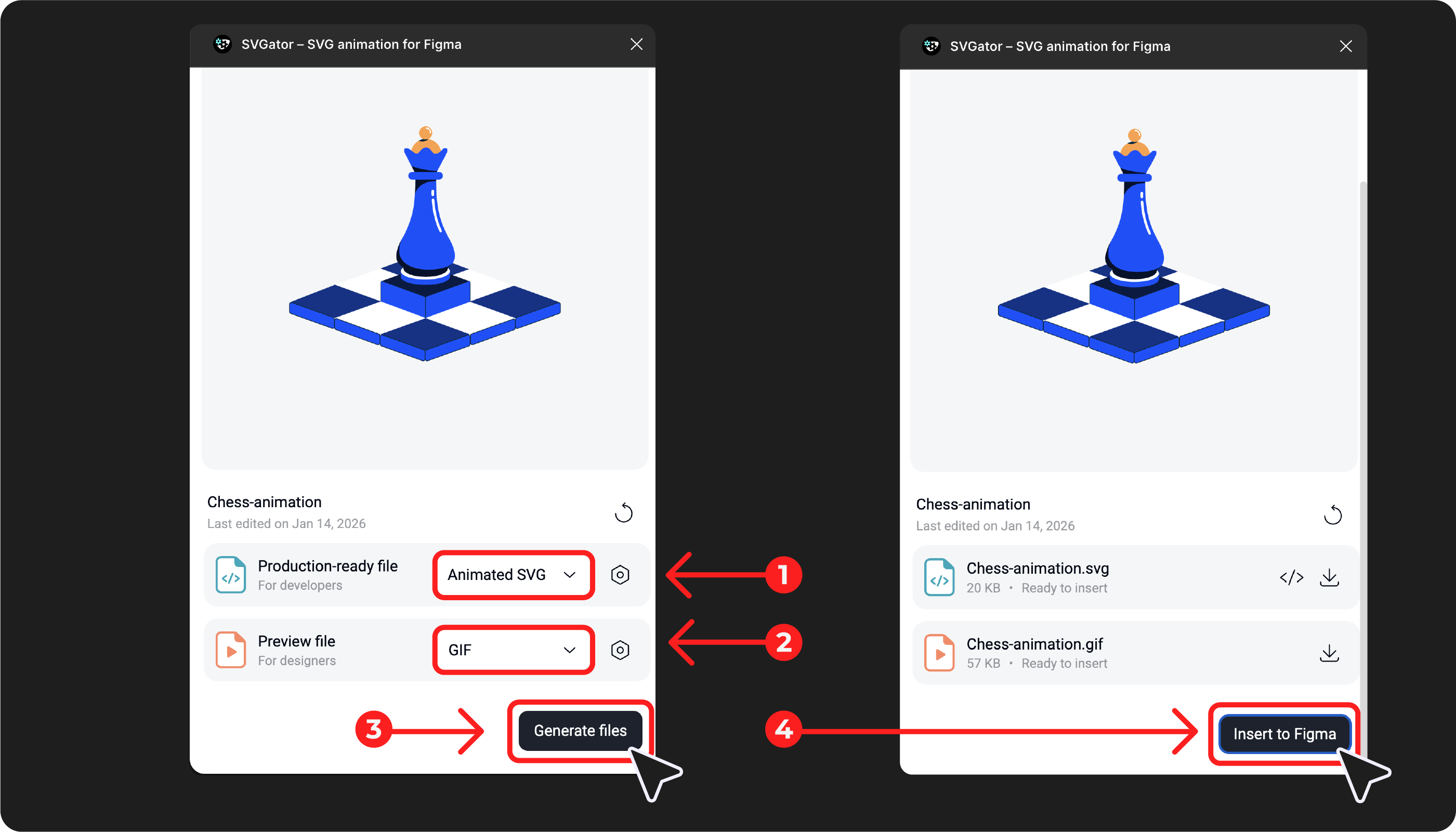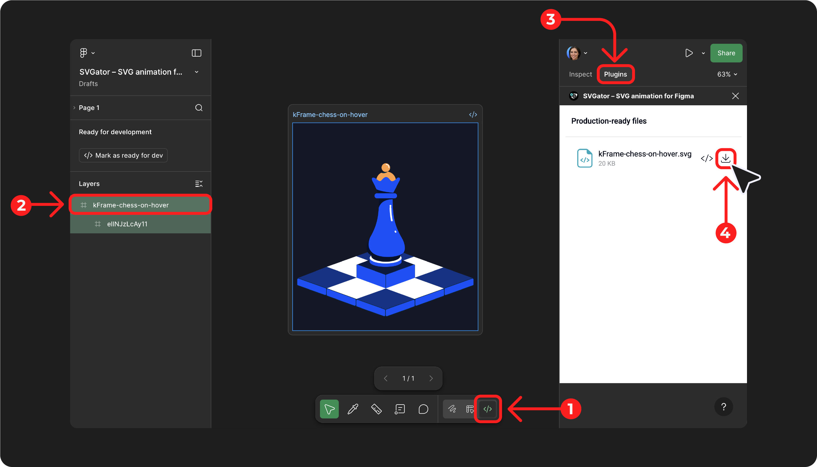All Figma users with Edit access can download production-ready files, not just the SVGator account owner. Developers without an SVGator account can also access them through the plugin.