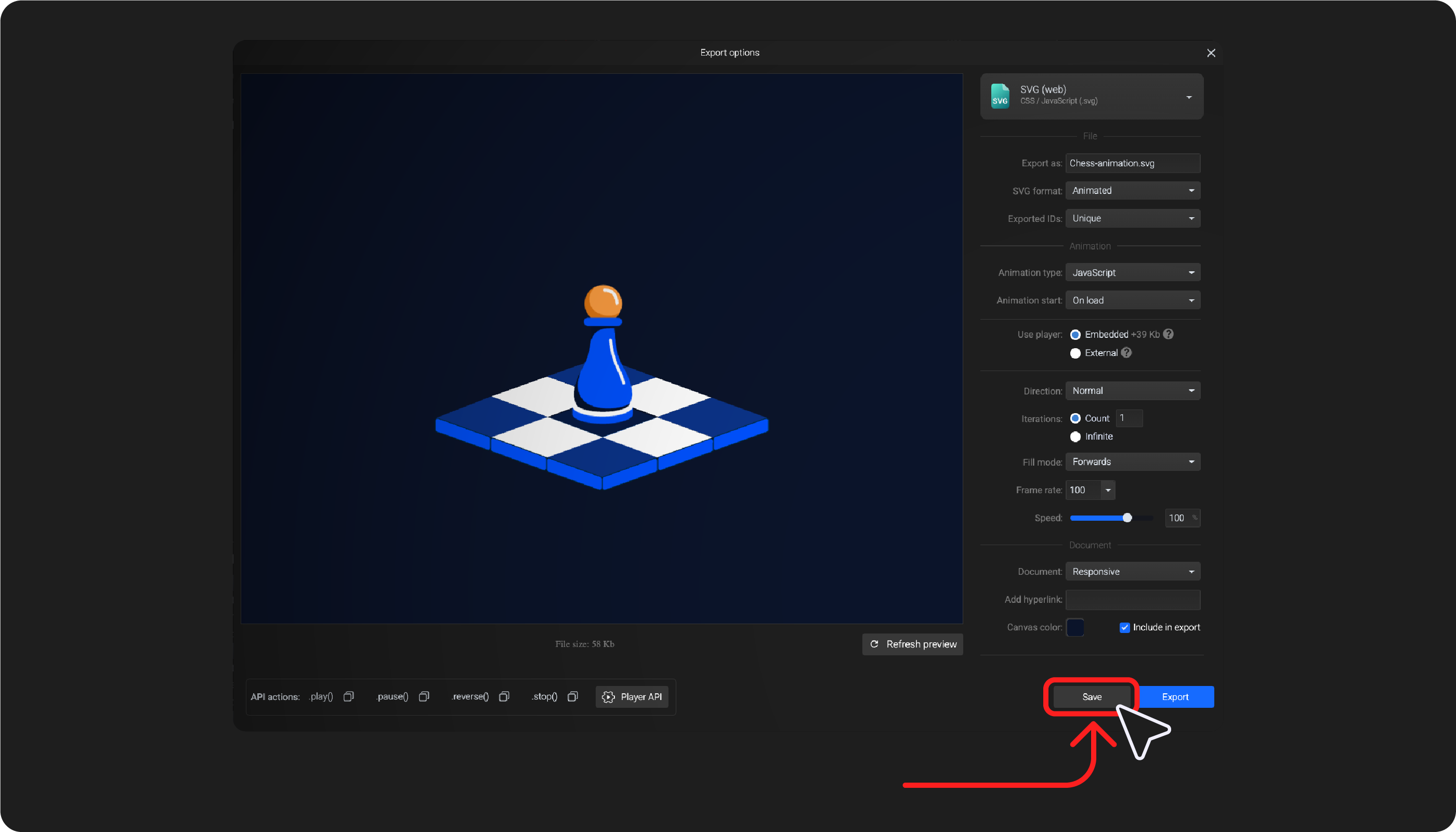 Note: Changes to the animation itself are saved automatically or with Ctrl/Cmd+S. Changes to Export options require clicking the Save button at the bottom-right of the screen.