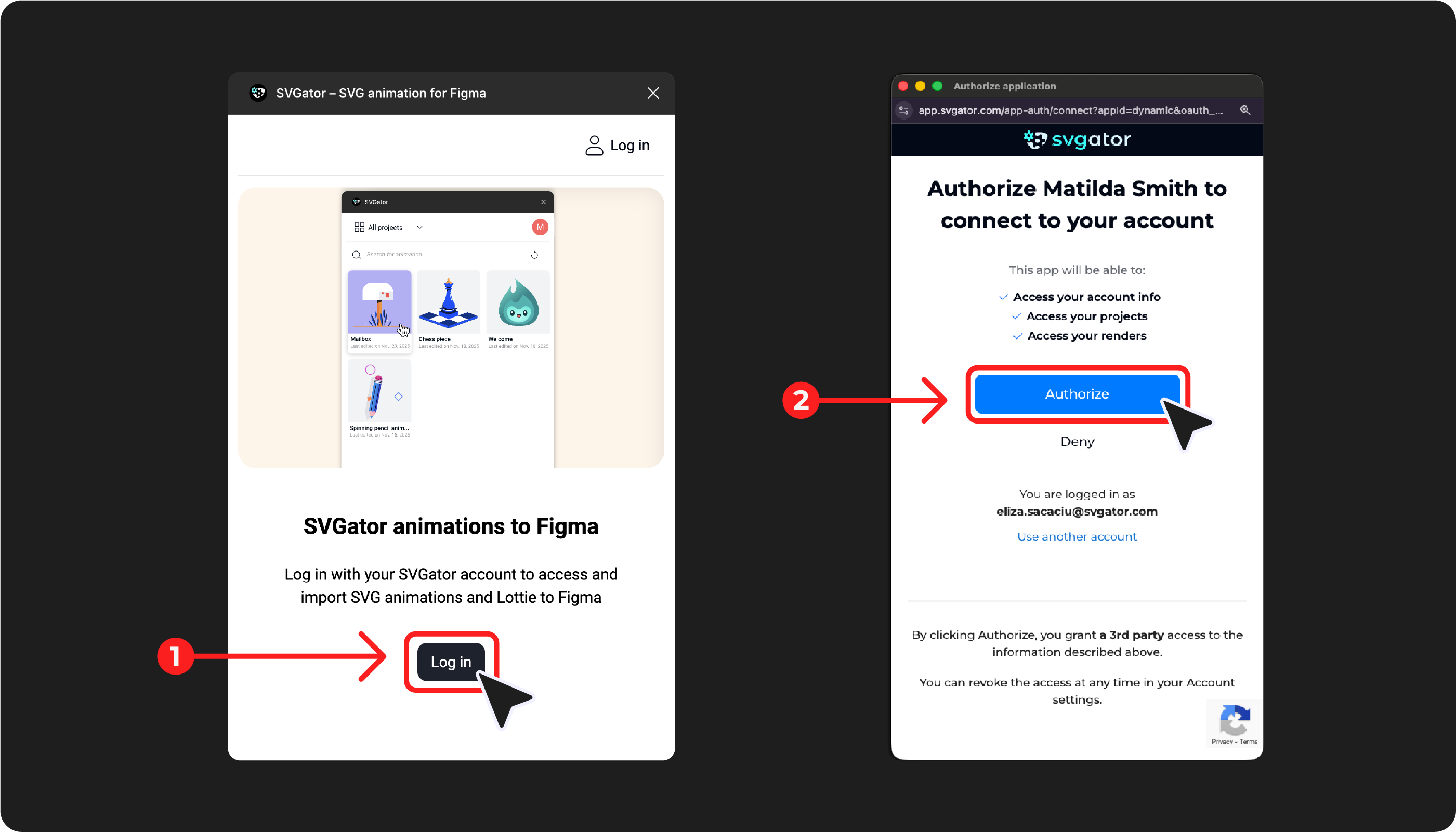 Click Log in, and when the authorization page appears, click Authorize to allow the SVGator plugin to access your SVGator account and its content.
