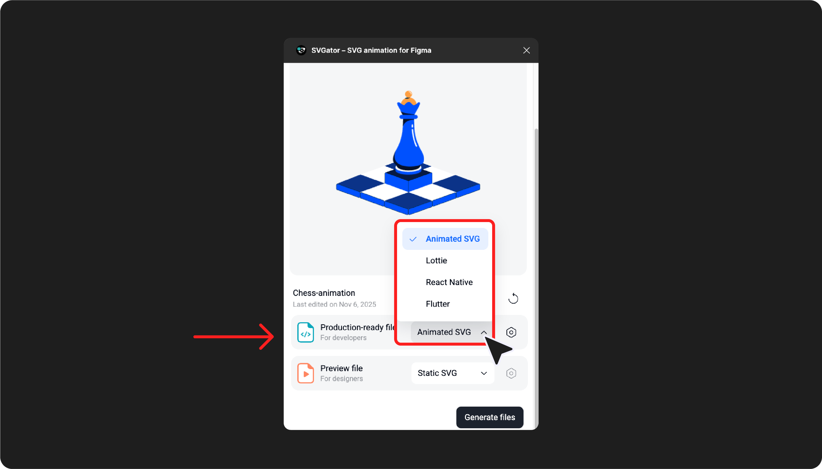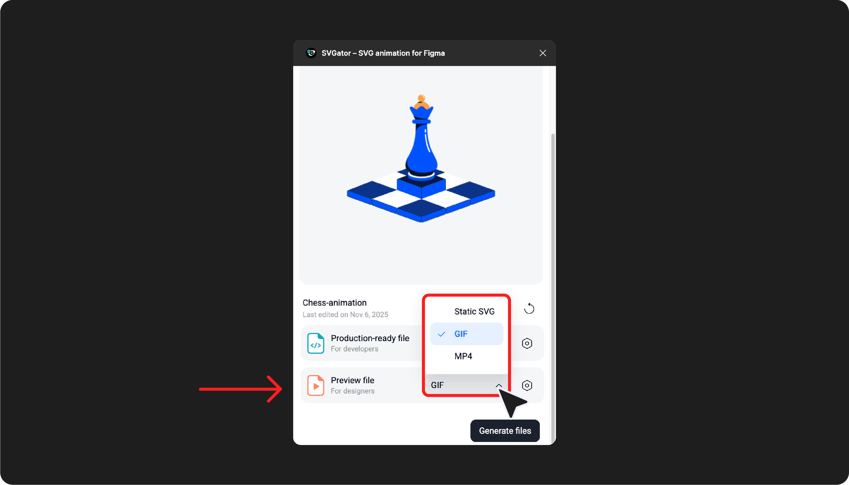 Since Figma doesn't support animated SVGs (but does support GIFs and MP4s), the plugin offers a Preview file option. This generates a static SVG, GIF, or MP4 that you can view in Present or Preview mode to see your animation play.
