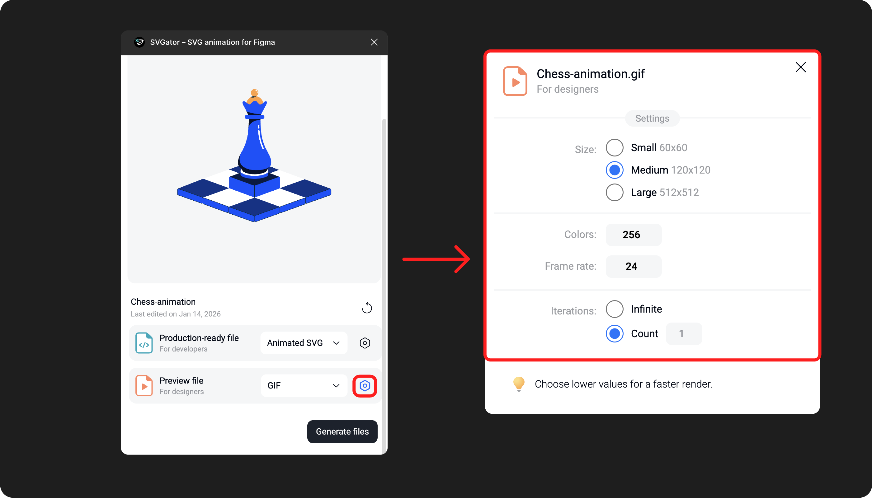 Note: The export settings selected in Figma Plugin reset with every render. The default settings will match the settings saved in the SVGator Export Panel.