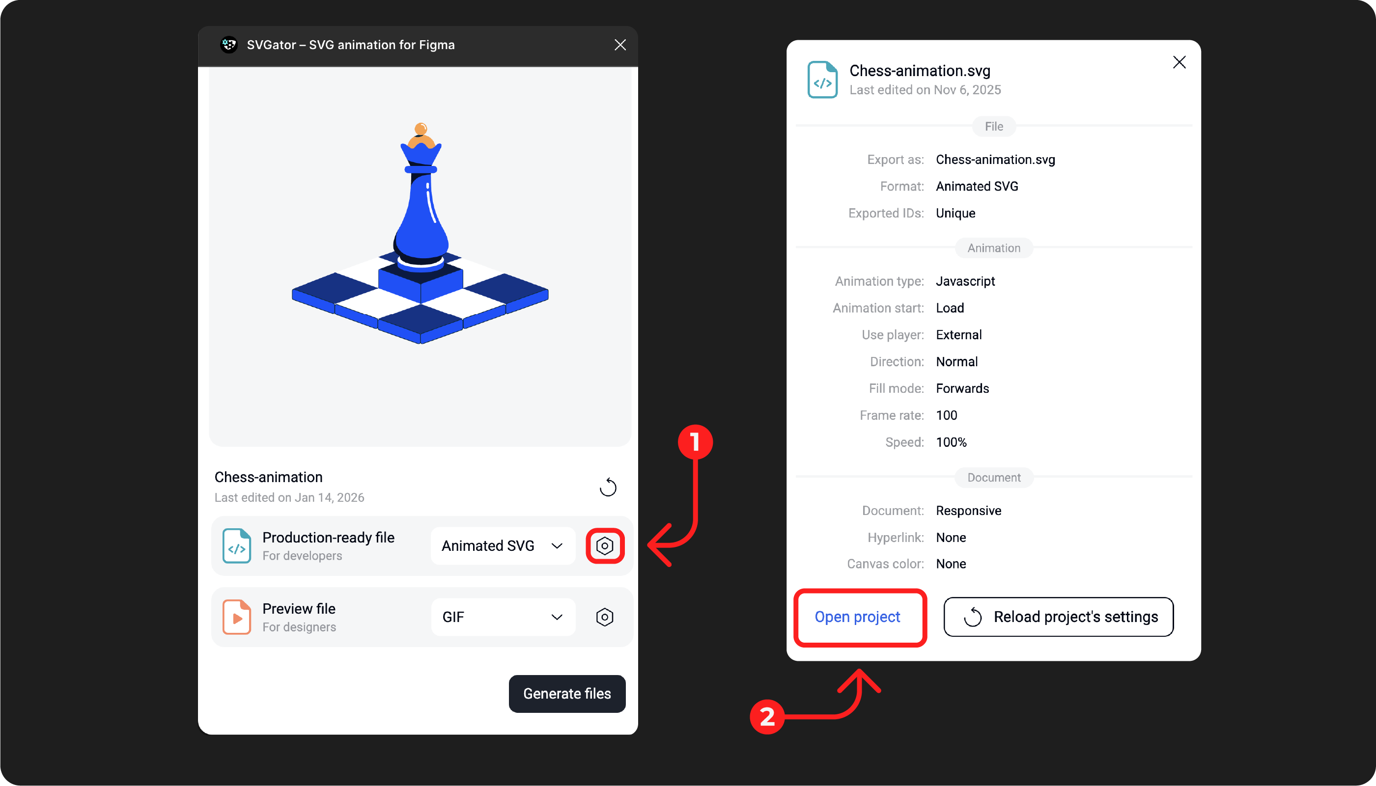 Click the gear icon next to Production-ready file, then click Open project to make changes in SVGator's editor.
